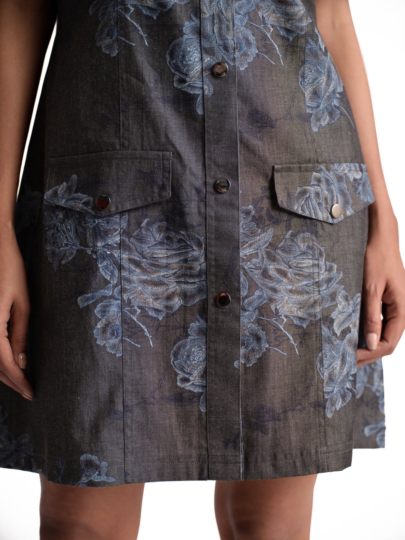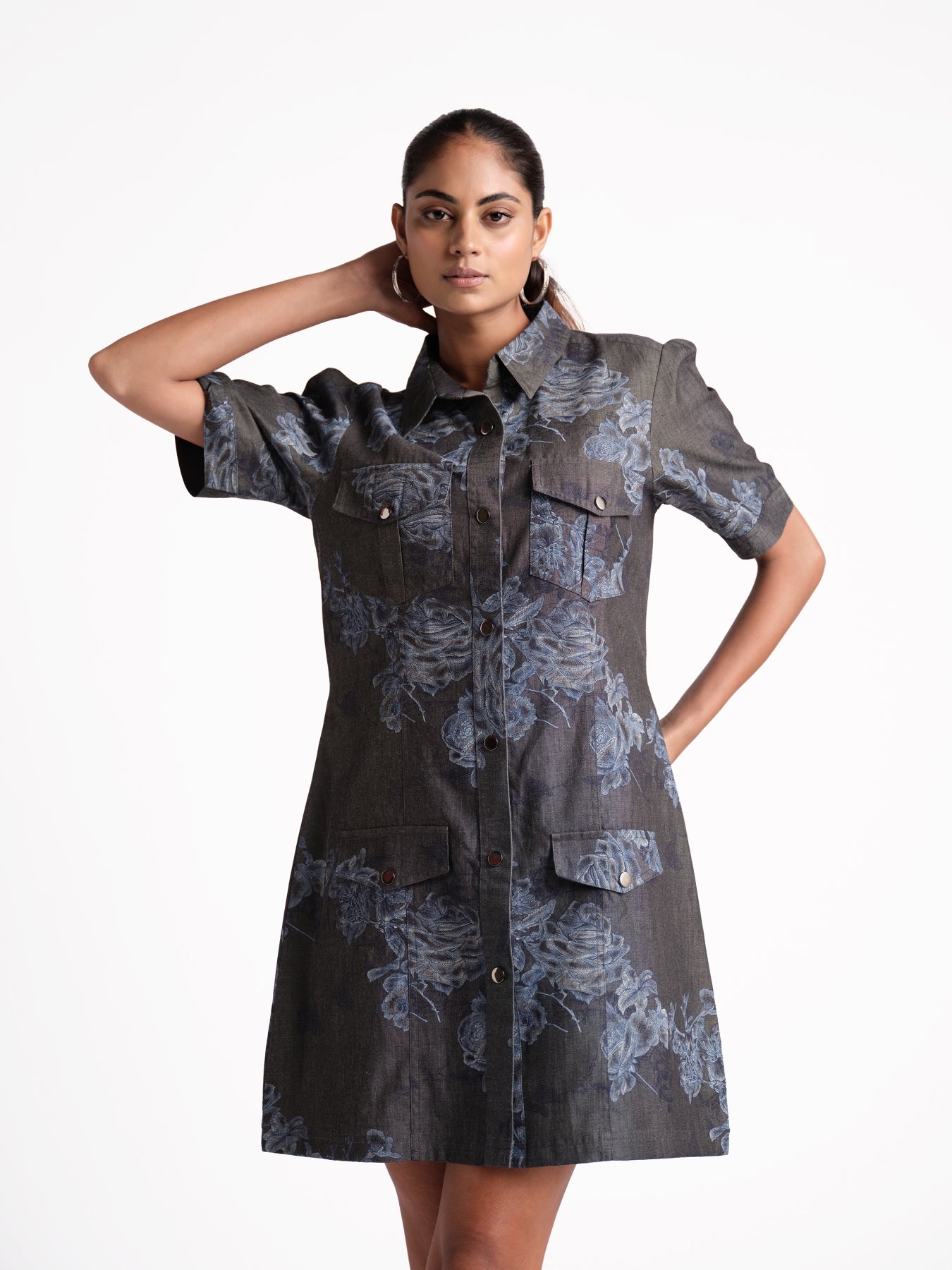 Featuring a Black Print Denim Pocket Shirt Dress.
