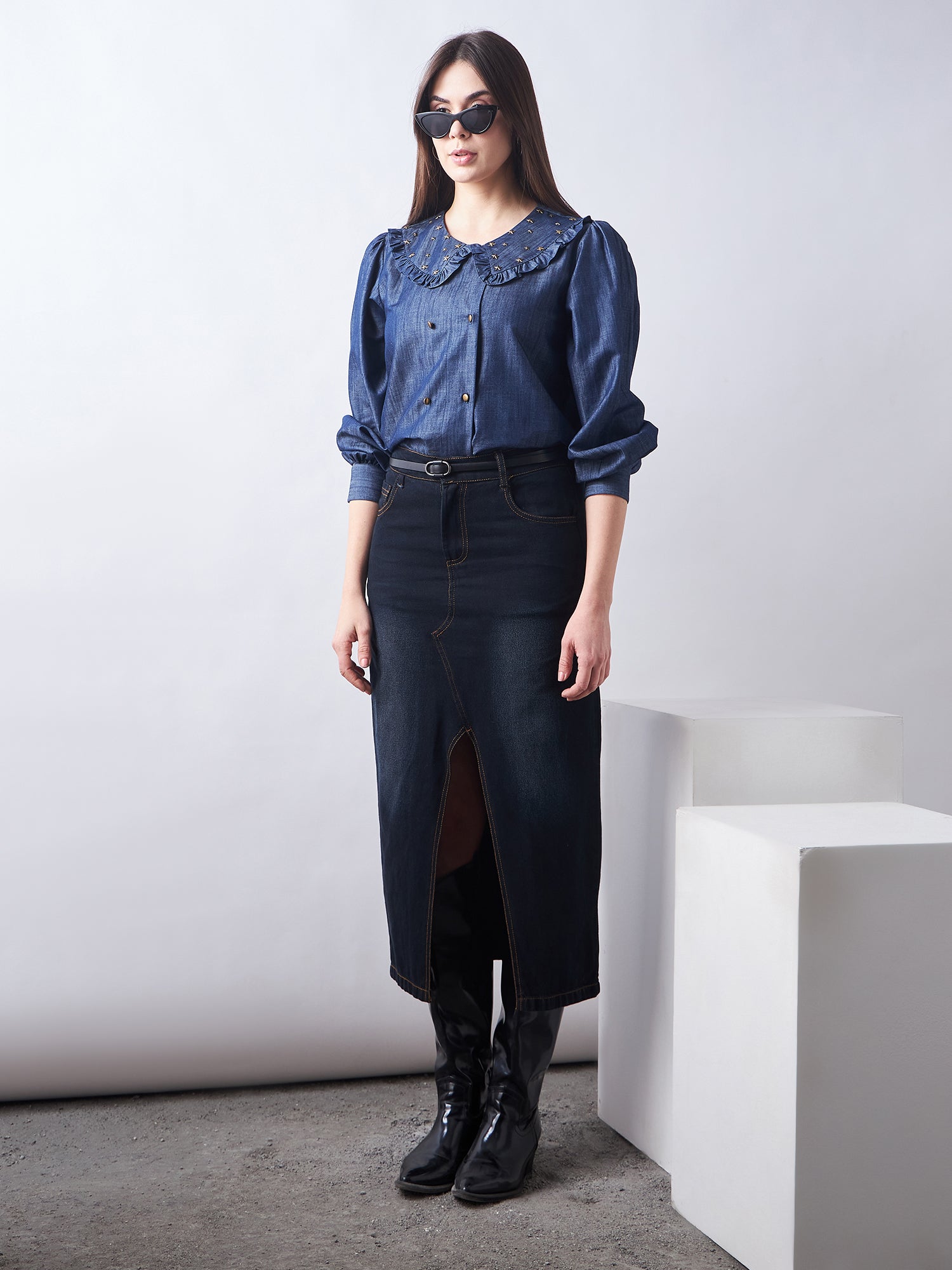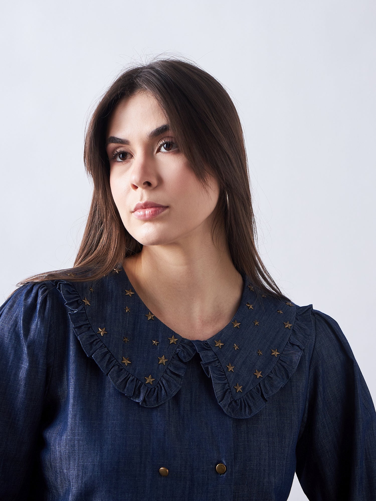 Featuring a Denim Shirt Which is Emblished with Studs & Ruffle Collar
