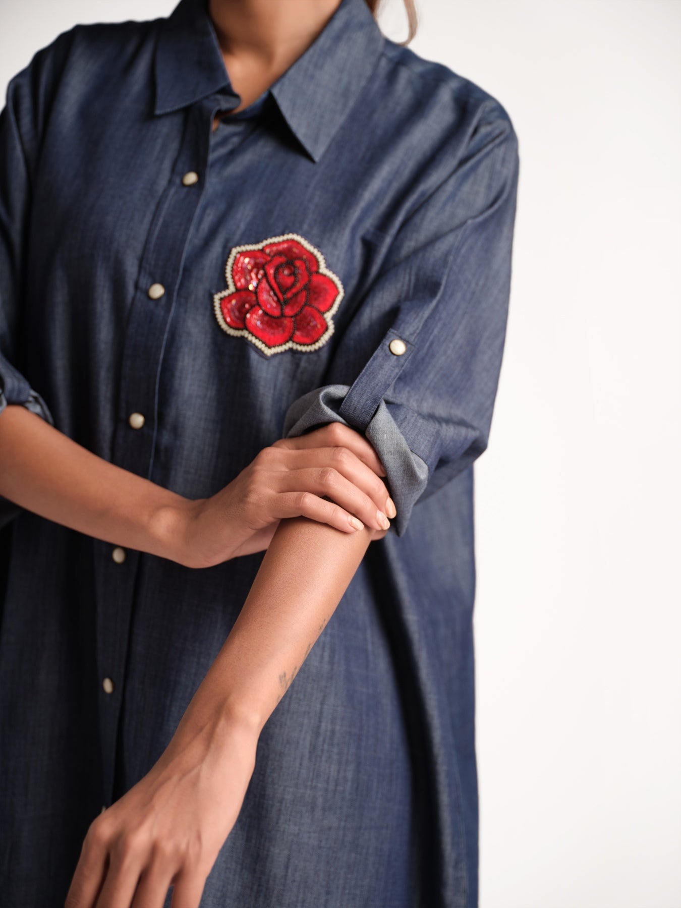 Featuring a Dark Denim Shirt Dress Emblished With Sequin Rose On Back & Front.