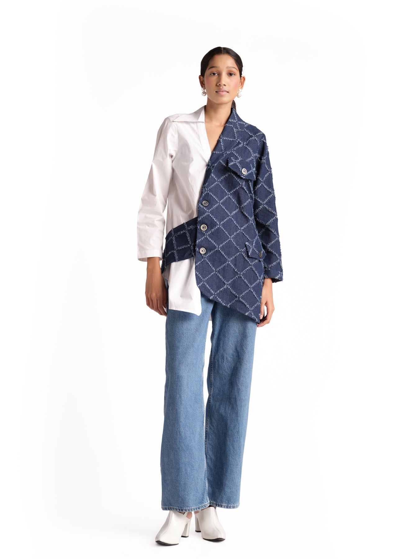 Featuring a Dark Frinze Denim Dress With a Mixture Of White Poplin.