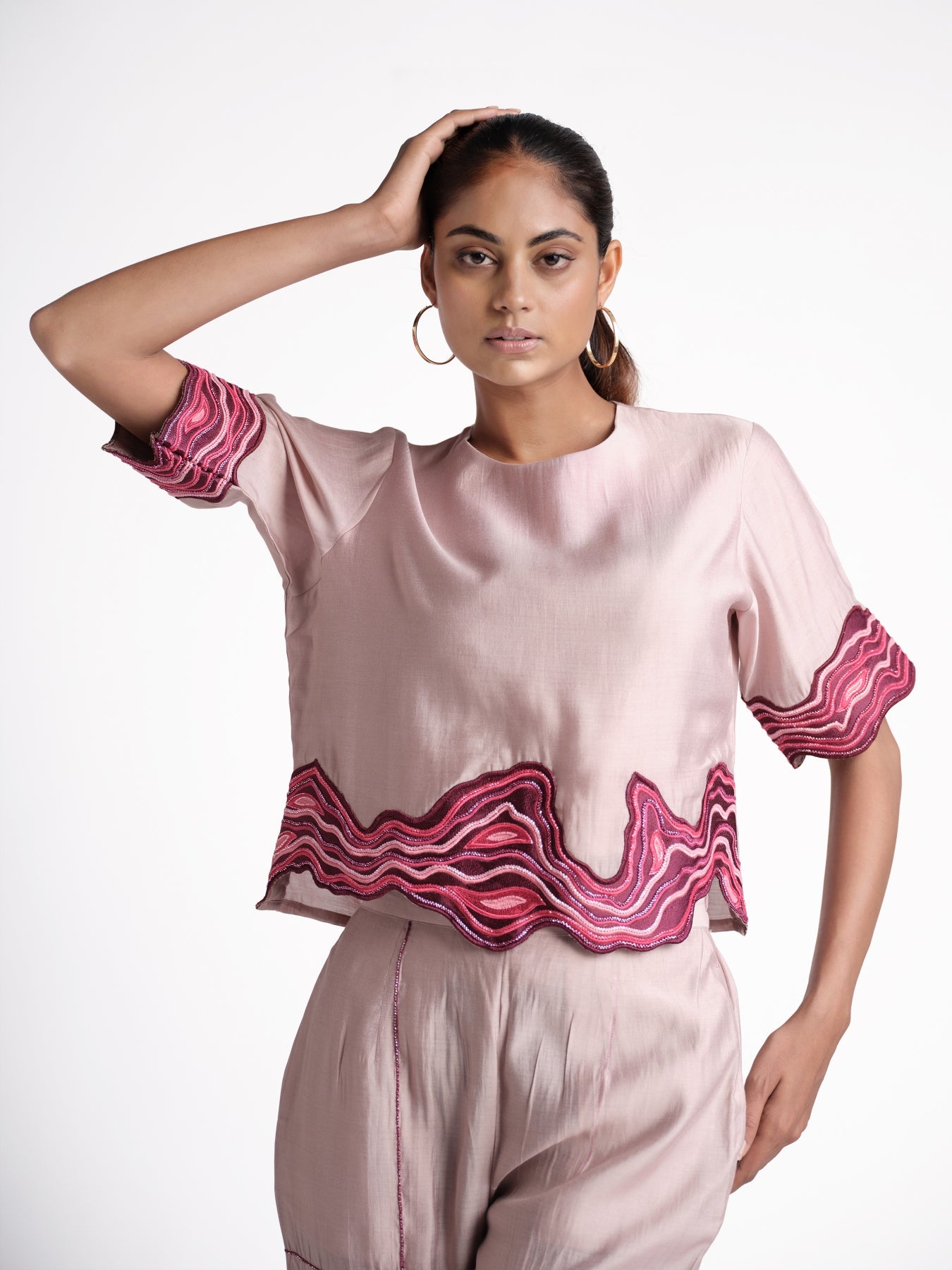 Featuring a Pink Drools Set Emblished Work on Pant & With Wavy Work on Top.