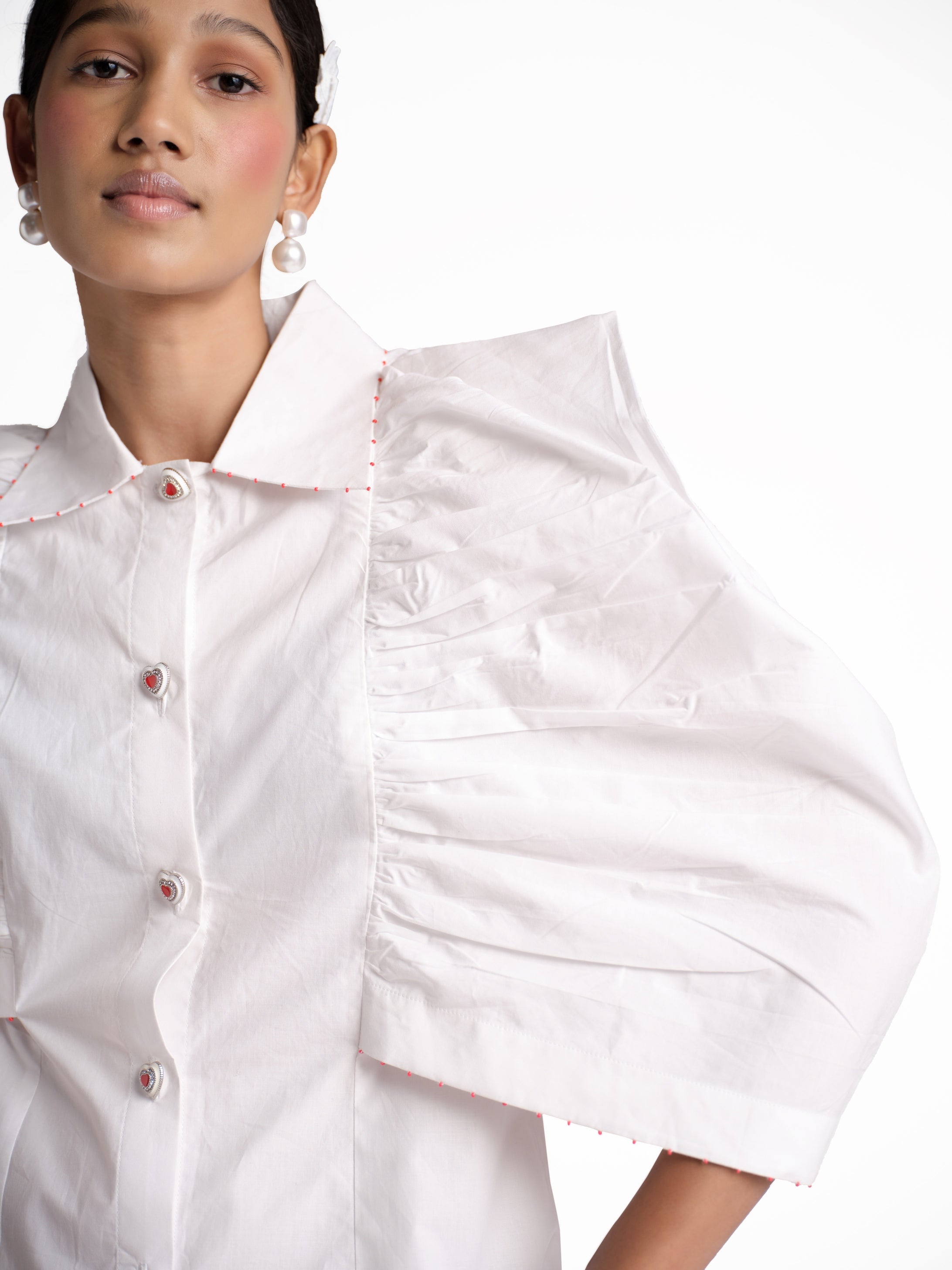 Featuring a white poplin shirt with ballon sleeves and emblished with minimal touch of hand work